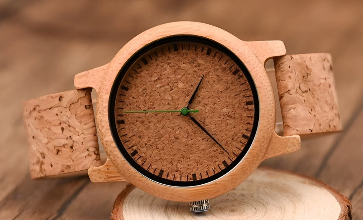 Inspirado en la naturaleza, este reloj combina una carcasa de bambú con una correa y esfera de corcho natural, creando una pieza única que refleja autenticidad y conciencia ecológica.